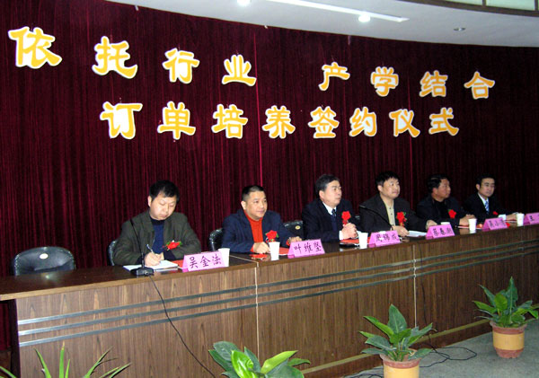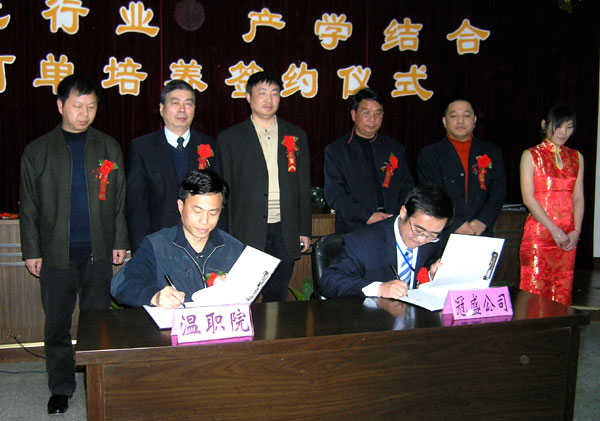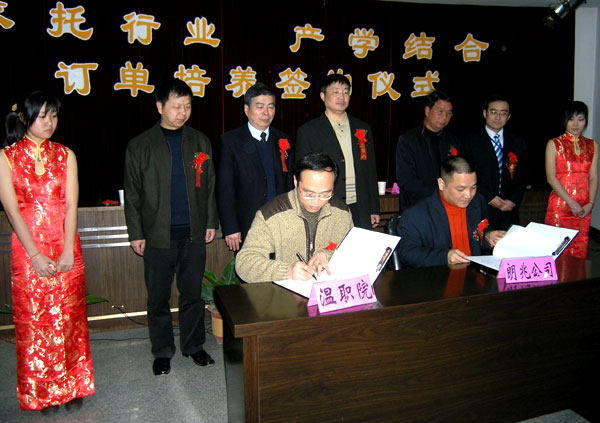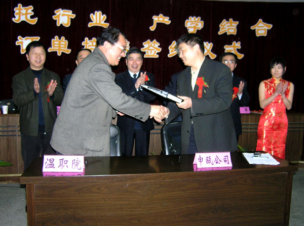 我院院长周锦成在签约仪式上介绍说,近两年,我市技能型人才紧缺,为了找到适合自己单位的技术人才,一些企业非常青睐订单培养,提前一两年介入学校教学,培养自己需要的人才。我院与一些企事业单位合作,曾相继举办了“正泰班”、“奥康班”、“旧城班”、“德力西”等,“订单”培养了一批电器专业人才、营销人才和物业管理人才,这些学生不仅实现了“零距离”就业,而且还深受企业欢迎。
