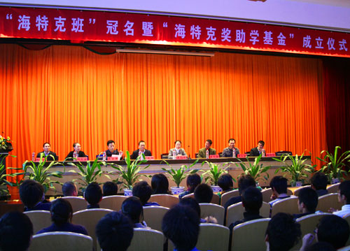 该班30多名学生是从我院机械系学生中经过严格笔试、面试挑选出的,提前被海特克“预订”。该班学生除了完成教学计划制定的课程外,还须根据海特克公司的要求,额外“加餐”学习企业文化、产品工艺、质量监控等。海特克公司还直接参与教学日常管理,让学校的教学与企业培训员工同步进行。35名学生完成学业后,将择优录用到海特克公司工作。在仪式上,还成立了“海特克奖助学基金”,提供10万元分年度对“海特克班”中技能过硬的学生实行奖励。公司还规定,凡是被该公司录用的“订单”学生,只要在公司工作满5年,将返回全部大学期间的全额学费。