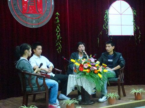 四位毕业生畅谈自己的就业、创业经历,以自己的亲身体会和经历为切入点,结合当前经济大环境向09届毕业生传授面试技巧、工作心得,创业体会等,为毕业生的就业之路导航。他们的幽默坦诚的言语、得体大方的举止与认真务实的人生态度,让在校生们领悟了许多道理。在交流中,还穿插了交流互动环节,同学们提问积极,气氛非常活跃。