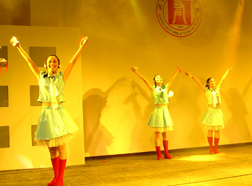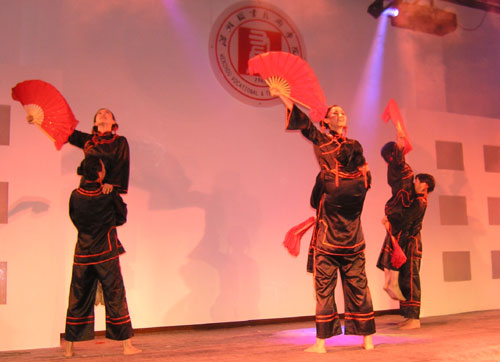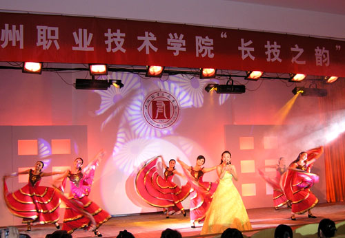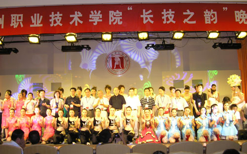 我院师生向专家自信地亮出了“拿手好戏”,展示了各个特色专业的技能。晚会最出彩的要数我院轻工学院选送的“概念鞋”、服装秀,学生模特们摆开秀场,向专家一一展示了我院师生的服装、概念鞋作品,其中许多作品曾在全国、省、市技能大赛中获奖。机械系选送的的“月球车”表演,工商系酒店专业选送的餐巾折花、茶艺表演、插花表演,英语俱乐部选送的英语歌曲联唱也博得了专家们和观众的阵阵掌声。另外,学生健美操队、教工舞蹈队联袂登场为晚会助兴,展现了我院师生良好的精神风貌,师生同台表演,其乐融融。晚会的另一亮点是音乐快板节目——《学院明天更辉煌》,唱出了温职院人“争优创示范”的自信与豪迈。晚会结束后,专家们亲切慰问了全体演职人员并与大家合影留念。