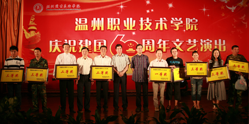 文艺汇演之前,学院举行了简短而庄重的“庆祝建国60周年暨学院师德先进个人颁奖仪式”,仪式由丁金昌院长主持,陈光天书记作了热情洋溢的讲话。陈书记回顾了中国自1840年鸦片战争以来的历史,他指出经过建国60年,特别是改革开放30年来艰苦卓绝的奋斗,昔日积贫积弱的中国发生了翻天覆地的历史巨变。勤劳、勇敢、智慧的中国人民在党的领导下,在古老的华夏大地上创造了举世惊叹的人间奇迹。在中国特色社会主义建设伟大事业进入新时期、踏上新征程之际,我院也迎来了发展历程中一个新的十年。十年来,我院整合了多方资源,实现了办学层次、办学水平、办学效益和社会声誉的大幅提升,高职教育的温州模式在全国打响了品牌。在祖国60周年华诞之际,陈书记祝愿祖国繁荣富强,也祝愿我院开创国家示范院校建设的新局面。随后,院党委副书记倪集崇宣读了《关于表彰温州职业技术学院师德先进个人的通知》,对苏北春等十位师德先进个人进行了表彰。