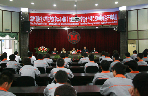 2009年11月9日上午,温州职业技术学院与加拿大不列颠哥伦比亚理工学院(British Institute of Technology,以下简称BCIT)合作项目2009级新生开学典礼在行政楼隆重举行。温州职业技术学院副院长夏晓军,加拿大不列颠哥伦比亚理工学院代表Cyrus Raoufi博士、Tracy Wang,相关部门负责人及机械系中加班09级新生到会。典礼由机械系主任吴百中主持。
