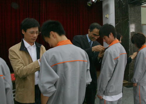 在教师代表和学生代表发言之后,机械设计与制造的48名09届新生在开学典礼上被授予BCIT校徽,正式成为中加班的第三批学生。