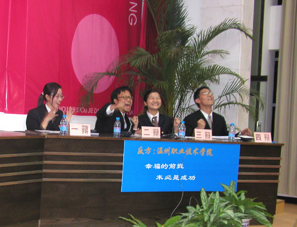 12月23日晚,温州市“久久杯”首届大专辩论赛在我院图书信息中心学术报告厅落下了帷幕。我院辩论队在最后决赛中,击败最后一个对手——浙江工贸职业技术学院笑到了最后。经过近一个月的训练和比赛,我院辩手们一路过关斩将高奏凯歌,击退了温州大学、浙江东方职业技术学院、浙江工贸职业技术学院等各路好手,荣登冠军宝座。同时,我院财会系的金勇同学还被评为本次辩论赛的最佳辩手。团市委书记温暖书记到场为我院辩论队进行了颁奖,表示祝贺。