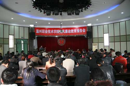 为加强党风廉政教育,深入推进反腐倡廉建设,12月2日下午,我院在一楼多功能厅举行党风廉政教育报告会,邀请温州市纪委常委、市监察局副局长韩建海作党风廉政教育报告。学院党委书记陈光天、党委副书记倪集崇,以及全院各党总支委员、各专业负责人(教研室主任)、行政科级以上干部参加报告会。报告会由纪委书记何忠主持。