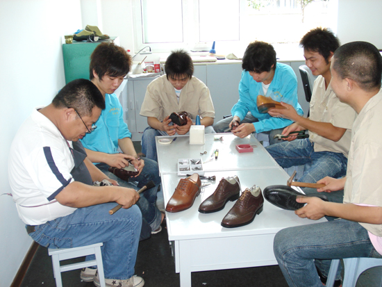 意大利传统制鞋工艺研究工作站的师傅们正在和学生一起探讨工艺技术问题