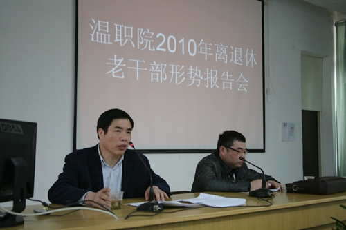 3月30日,我院2010年离退休老干部形势报告会在成教学院召开,院党委书记陈光天通报了我院去年的工作和下一步发展思路。院党委副书记倪集崇出席会议。会议由组织部长徐利群主持。