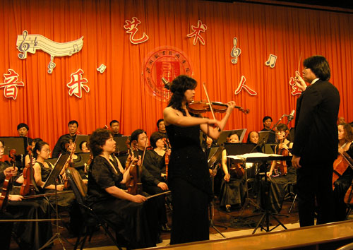 “《中国心》、《梁祝》、《白毛女》等经典曲目震撼人心,被誉为英国第二国歌的《威风堂堂》的确很大气……今晚真实有幸,能够在学校里欣赏到这样的演出。第一次近距离接触交响乐。”在校园中免费聆听完交响乐后,一位大学生在自己的博客写下了这样一段话。5月24日晚,浙江省歌舞剧院交响乐团的艺术家们走进了我院校园,在学术报告厅为师生奉献了一场精彩的演出。一支支中外名曲,把师生带入了高雅的艺术殿堂,让大学生们不出校门免费享受到高雅艺术的熏陶。