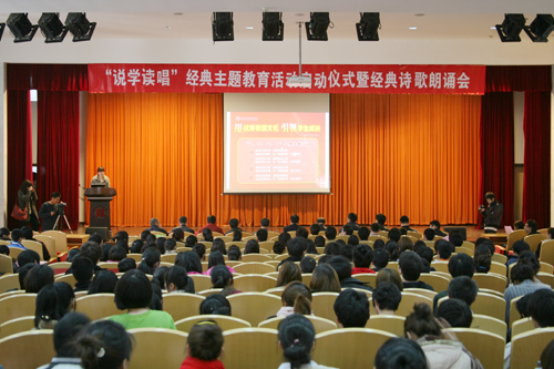 启动仪式后,来自学院大学生艺术团主持队的同学们为在场的观众奉献了一场经典诗歌朗诵会,以爱国、奋进、励志等为主题的经典诗歌引起了广大同学的共鸣,朗诵会在全体与会人员齐诵诗歌《向前冲》中圆满结束。