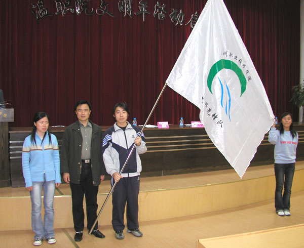学院党委副书记(图左二)授旗给“文明先锋队”队员
