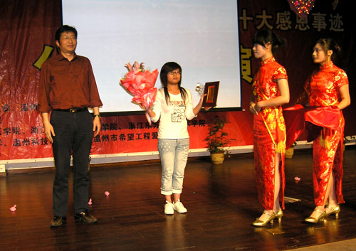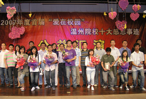 一个人,一个故事;一份爱,一份感动。5月16日晚,伴随着一曲《爱的奉献》,温州高校“爱在校园”十大感恩事迹汇报演出的帷幕缓缓拉上。随之也产生了2007年度首届“爱在校园”温州院校十大感恩人物(团体)。温州医学院王飞达,温州大学人文学院04中本3班、城市学院爱心专列号,温州职业技术学院王丽丹、叶丽娜,浙江工贸职院郭晓敏,温州科技职业学院志强社,浙江东方职院邓春晖、06会计2班,温州电大青年志愿者等榜上有名。