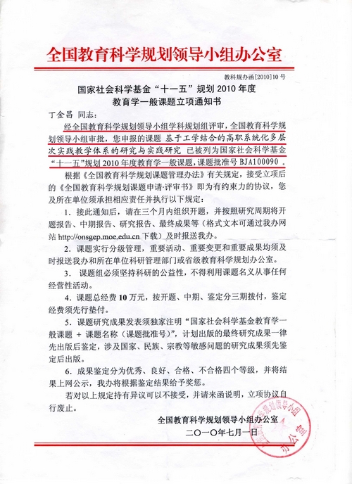 近年来,我院坚持走产学研结合的办学之路,在学院领导的高度重视和支持下,我院不断加大对科研教改的投入力度,努力改善科研环境,先后成立了24个市、院级研发平台,形成浓厚科研氛围,全院教师参与科研教改的积极性也日益高涨,科研工作稳步向前、捷报频传。日前,我院在国家、省级重大课题立项方面更是获得突破性进展。据全国教育科学规划领导小组办公室下文(教科规办函〔2010〕10号),我院丁金昌院长主持的《基于工学结合的高职系统化多层次实践教学体系的研究与实践研究》(课题编号BJA100090)获国家社会科学基金“十一五”规划2010年度教育学一般课题立项,获得10万元资助。另,王向红副院长主持的《用图论等方法研究蛋白质的逆折叠问题》(项目编号Y6100033)获省自然基金项目立项。