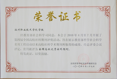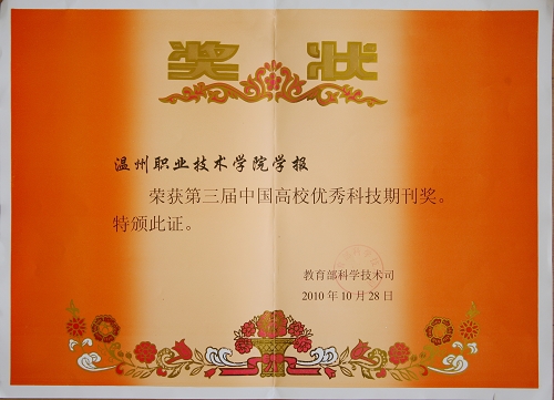 近日,受教育部科学技术司委托,由中国高校科技期刊研究会组织的第三届“中国高校精品•优秀•特色科技期刊评比活动”揭晓,《温州职业技术学院学报》从全国高校近500种科技期刊中脱颖而出,被评为“中国高校优秀科技期刊”。浙江省7种科技期刊入选,温州职业技术学院是全国唯一一所获此殊荣的高职院校。