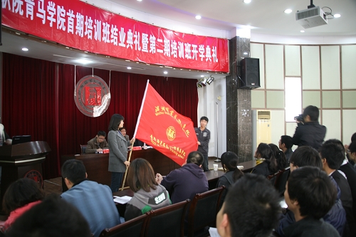 随后,第一期青马学员代表项若如向第二期学员代表蔡青宋同学授旗,预示着第二期培训就此开班。第二期学员代表虞晓卉做了简单的发言,并代表培训班全体成员做出了五大承诺:一、坚定共产主义信仰,坚决拥护共产党领导;二、潜心钻研马克思主义理论;三、学以致用,知行合一;四、努力学好自己的专业技能;五、结合马克思主义理论,在各项工作中,注意观察与研究新事物,积极探索。