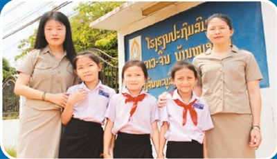 老挝万象农冰村小学学生与来自中国的汉语教师志愿者。 |