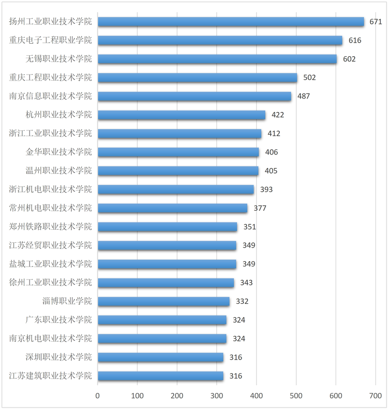 在专利申请总量排名前 20 所的高职院校中,扬州工业职业技术学院以 671 件排名第一;排名第二的是重庆电子工程职业学院,专利总量616 件;排名第三的是无锡职业技术学院,专利总量 602 件。