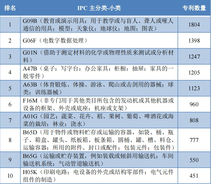 在全国高职院校申请专利技术领域中,G09B(教育或演示用具;用于教学或与盲人、聋人或哑人通信的用具;模型;天象仪;地球仪;地图;图表)的专利数量最多,达1804件;其次是G06F(电数字数据处理),专利数量1398件;第三是G01N(借助于测定材料的化学或物理性质来测试或分析材料),专利数量1247件。此外,依次还有A47B(桌子;写字台;办公家具;柜橱;抽屉;家具的一般零件)、A63B(体育锻炼、体操、游泳、爬山或击剑用的器械;球类;训练器械)等。