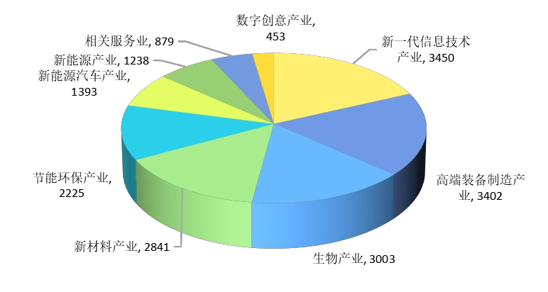 在全国高职院校专利技术对应的战略性新兴产业分布中,新一代信息技术产业的专利数量最多,达3450 件;其次是高端装备制造产业,专利数量 3402 件;第三是生物产业,专利数量 3003 件。此外,依次是新材料产业、节能环保产业等。