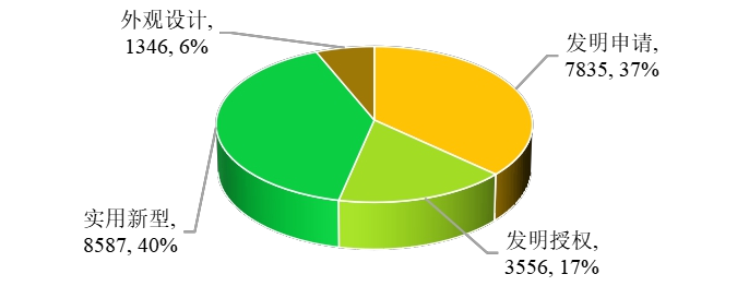 《报告》显示, 2022 年“双高建设”院校累计申请专利 21324 件,其中发明专利711391件,包括发明申请 7835 件和发明授权 3556 件。另外,实用新型专利 8587 件,外观设计1346 件。