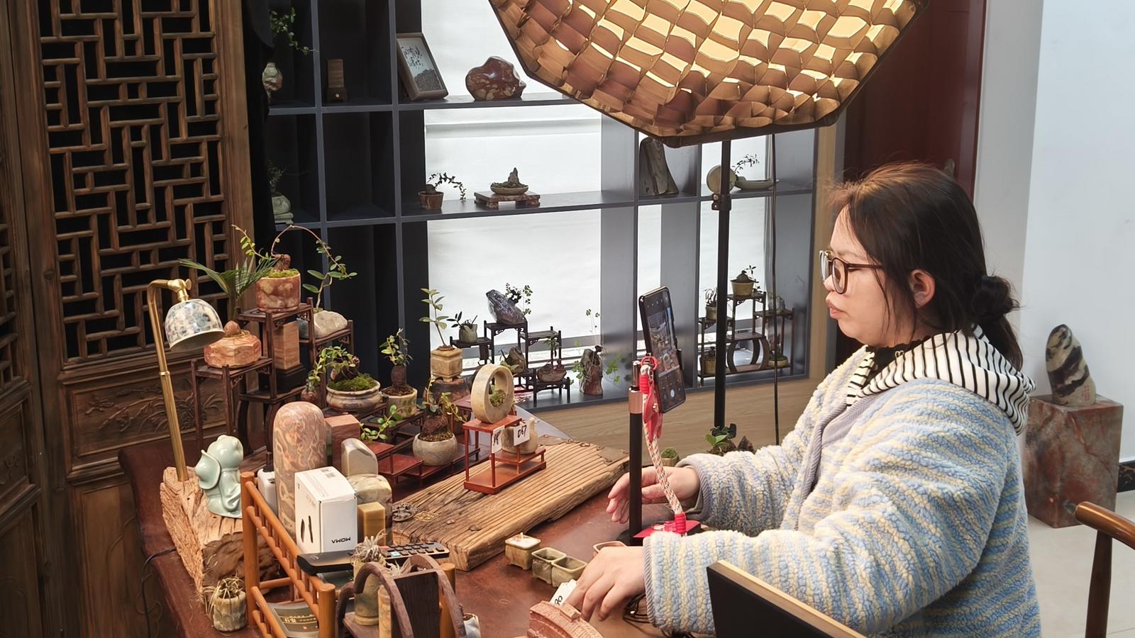 石尚花开共富工坊工作人员正在直播泰顺石工艺品等(曾庆华 摄)