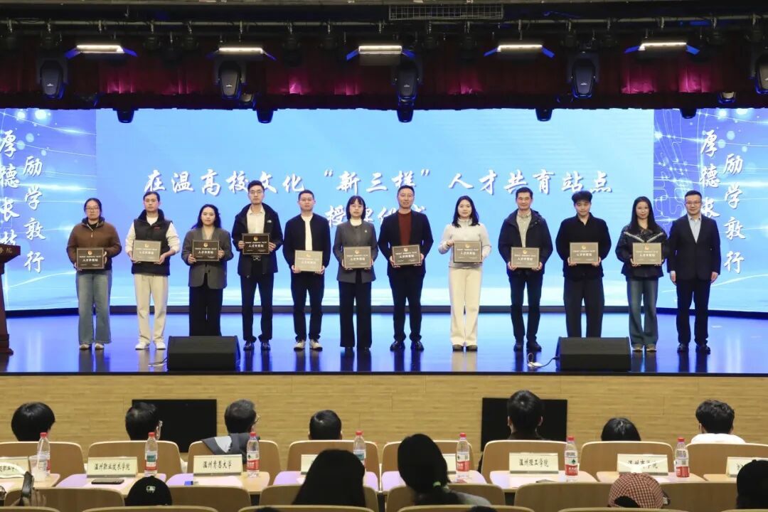共青团温州市委书记谷川为各在温高校授予“‘温青创艺’在温高校文化‘新三样’人才共育站点”牌匾,标志着校地人才共育网络正式成型。