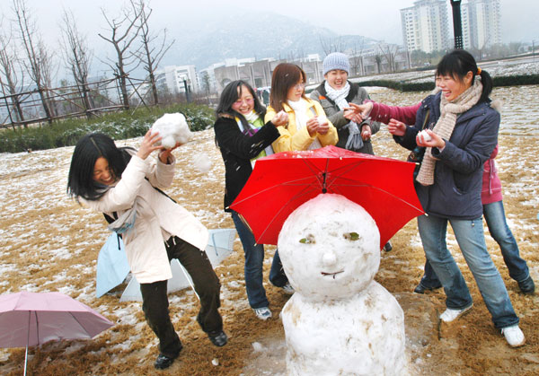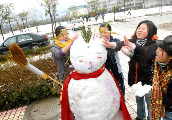 昨天,温州大学城里白雪皑皑,温州职业技术学院校园内,几名学生堆了个大大的漂亮雪人。