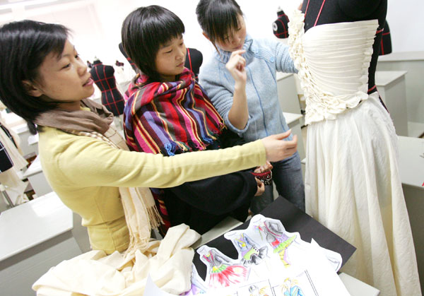 浙江省2005年全省技能大赛时装设计竞赛本月22日晚结果揭晓,温州职业技术学院学生梁小燕、陈圆圆、马伊幸分别获得比赛第二、三、五名。进入比赛前三名的梁小燕、陈圆圆将代表我省参加全国“东部地区时装设计师”的技能比赛。图为梁小燕(中立者)、陈圆圆(右一)在指导老师章瓯雁(左一)的指导下“备战”。