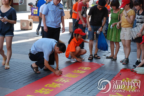 在五马街口,志愿者们拉开了“垃圾不落地,城市更美丽“的宣传横幅,并带头签上自己名字。随后,不少市民也积极参与到了签名活动中,其中还不乏刚刚放学小学生和闻讯而来路人,他们纷纷表示要从自身做起、共同维护地球的清洁。此外,志愿者还兵分多路对五马街区大街小巷、垃圾死角进行清扫,并向市民和沿街店铺发放近400份“垃圾不落地倡议书”,宣传“节约资源、爱护花草”等环保理念。(通讯员 谷若)