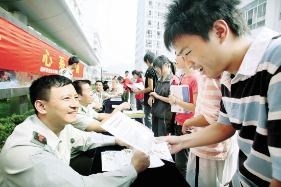 10月27日上午,温州市瓯海区人武部干部来到位于温州市大学城的温州职业技术学院,开展征集在校大学生入伍宣传活动,受到了大学生的关注和欢迎。图为人武干部为大学生们解答参军相关政策。
