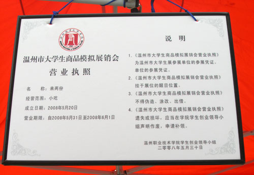 财会系大一学生蔡克峰将这个“营业执照”挂在寝室的书桌前,打扫卫生的时候也不忘帮它抹个灰尘。“这是学校发的,我们周末去草根园摆地摊的时候必须带着它。”蔡克峰和自己同寝室的几个兄弟组成了一个地摊团队,每到周末就到学校指定的地摊区——工商系楼下的一个1000平方米左右的空地上摆地摊。蔡克峰经营的商品是护发系列,洗发水、护发素等,一个月有300元左右的利润。