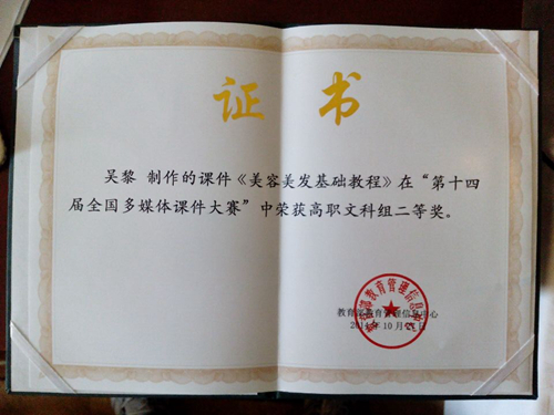 日前,全国多媒体课件大赛现场决赛于10月25、26日在北京大红门国际会展中心举行。经过激烈的角逐,我院信息技术系吴黎老师凭借课件《美容美发基础教程》荣获第十四届全国多媒体课件大赛高职文科组二等奖。