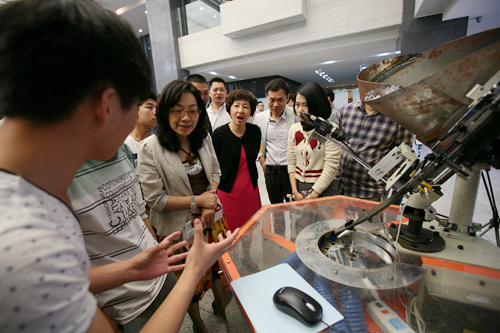 温职院副院长王向红、王志梅现场观看了机械学子的毕业设计作品后,很是高兴。在学院领导看来工科类制作的实物毕业作品最有意思,最能把大学三年学到的综合能力淋漓尽致地体现出来。温职电视台的工作人员看到这些让全场都能“动起来”的把作品也是惊喜连连,全程录制了每件实物作品,并进行了一一采访,了解了每件产品的设计与制造过程。