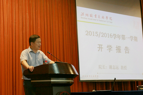 会上,谢院长提出了新学期学院工作的指导思想,要求广大教职工继续深入学习贯彻国家、省职业教育工作会议精神,以立德树人为根本,以服务发展为宗旨,以促进就业为导向,坚持走内涵式发展道路,坚持教育以学生为本、办学以教师为本的理念,朝着创建一所具备更高层次职业教育培养能力的特色优质高职院校而努力奋斗 。同时,谢院长指出,本学期要抓好七个方面工作,即加强教育教学改革,推动人才培养上水平;加强立地式研究,推动科研工作上新台阶;以服务发展为导向,打造社会服务新亮点;以立德树人为根本,优化全学程育人体系;坚持办学以教师为本,加强师资队伍建设;推进机制改革和创新,激发学院办学活力;推进党建工作,强化政治和组织保障能力。谢院长谈到, 2015年是全面完成和总结“十二五”发展规划的收官年,又是谋划和提前实施“十三五”发展规划的承上启下年,希望广大教职工幸福生活,尽心教学,潜心育人,朝着创建一所具备更高层次职业教育培养能力的特色优质高职院校共同努力奋斗 !