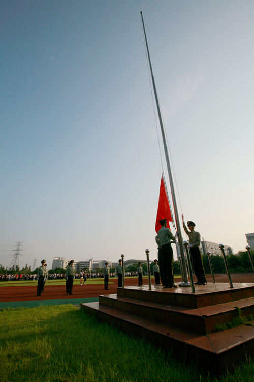 迎着朝阳,学院国旗护卫队成员迈着铿锵的步伐来到了国旗台下,全场一片肃静。在激昂的《义勇军进行曲》中,升旗手振臂一挥,鲜艳的五星红旗徐徐展开,在初升的阳光映照下,全体师生的注目中,迎着初升的太阳,在晨曦中迎风飘扬在温职院的上空。