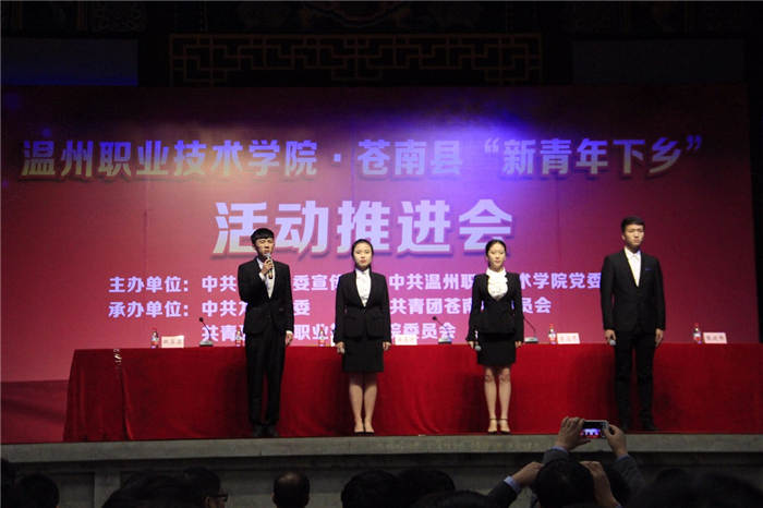 会议期间,还举行了苍南县委书记黄寿龙为我院“新青年下乡”团队代表授旗、王靖高书记为各乡镇代表授牌、温职院全体学生代表宣誓等一系列仪式。会后,我院学生为村民奉献了一台简短却不乏精彩的文艺演出。