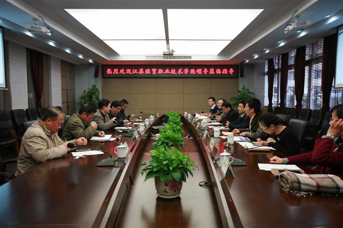 1月15日下午,江苏经贸职业技术学院院长薛茂云带队来访我院学习交流,我院院长谢志远接待了江苏经贸职业技术学院一行,薛院长一行参观了学院的实训基地、图书馆、技术研发大楼之后,于研发楼三楼会议室召开座谈会。