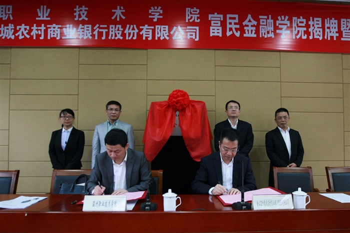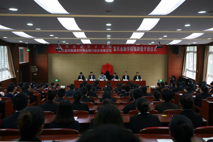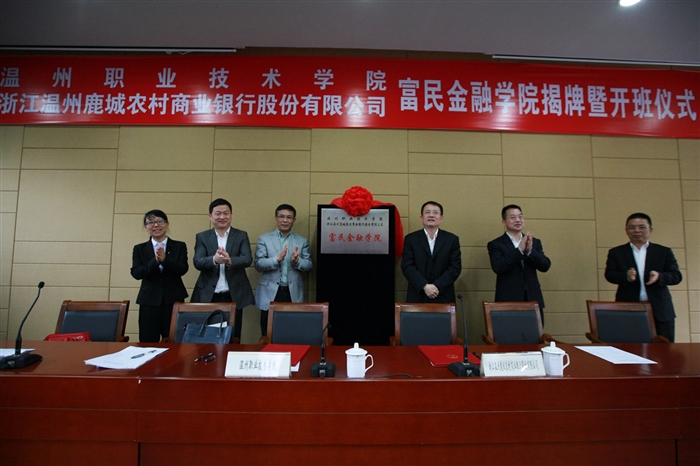 4月21日上午,温州职业技术学院与鹿城区农商银行联办富民金融学院签约揭牌暨开班仪式在我院成教学院举行。谢志远院长与吴加居行长签订合作协议,王靖高书记与陈宏强董事长为富民金融学院成立揭牌。我院党委书记王靖高、院长谢志远、副院长王志梅以及鹿城农商银行领导、相关部门负责人以及富民金融学院的学子们出席了开班仪式。