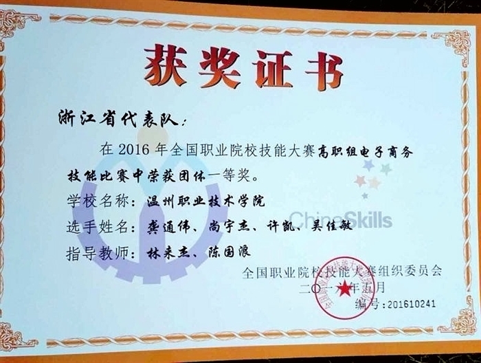 5月13日, 2016年全国职业院校技能大赛高职组“电子商务技能赛项”比赛在天津商务职业学院举行。由我院信息技术系电子商务教研室林来杰、陈国浪老师指导,龚通伟、尚宇杰、许凯、吴佳敏四位学生组成的代表队,凭借扎实的技术、良好的团队合作,经过整整一天的鏖战,最终在全国81支代表队中脱颖而出,以总成绩第3名的优异成绩荣获团体一等奖,林来杰、陈国浪老师荣获优秀指导老师奖。