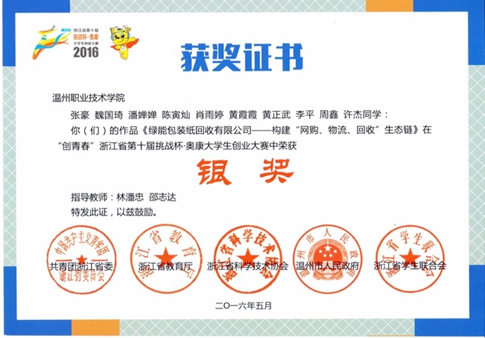5月20至22日,由共青团浙江省委员会、省教育厅、省科学技术协会、温州市人民政府、省学生联合会主办的“创青春”浙江省第十届“挑战杯”奥康大学生创业大赛在温州医科大学举行。我院参赛学生与本科生、研究生同台竞技,经过激烈角逐最终荣获2个银奖和4个铜奖。我院同时获得“最佳进步奖”。本届大赛自今年初启动,全省共有73所高校近6万大学生参与校级选拔赛,其中918个项目参加省级复赛,54所高校230个项目入围省级决赛。