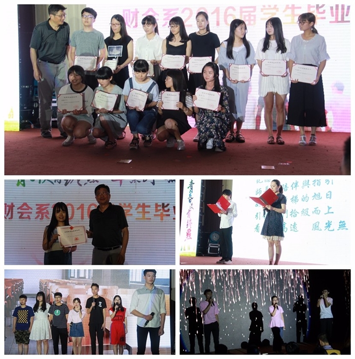 回首往日艰苦拼搏为理想,展望明天放飞青春奔前程。2016年6月25日晚,我院财会系2016届学生毕业典礼在明德楼树人堂隆重举行, 财会系500名毕业生即将踏出校门,奔赴前程。学院纪委书记何忠、财会系党总支书记吴冰、副主任简家进、副主任王赛芝等领导,13级各教研室、各班班主任教师出席了典礼。