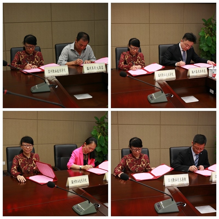 9月28日,温州职业技术学院酒店管理专业“现代学徒制”产学合作研讨暨人才培养基地签约授牌仪式在学院研创大楼三楼会议室隆重举行。我院院长谢志远、副院长王志梅,温州旅游局杨茂富副局长,温州王朝大酒店董事长朱志群、温州喜来登大酒店总经理冷骏、温州滨海大酒店总经理陶珍瑶、温州香格里拉行政副总吴文女士等嘉宾及工商管理系师生代表参加了本次仪式。