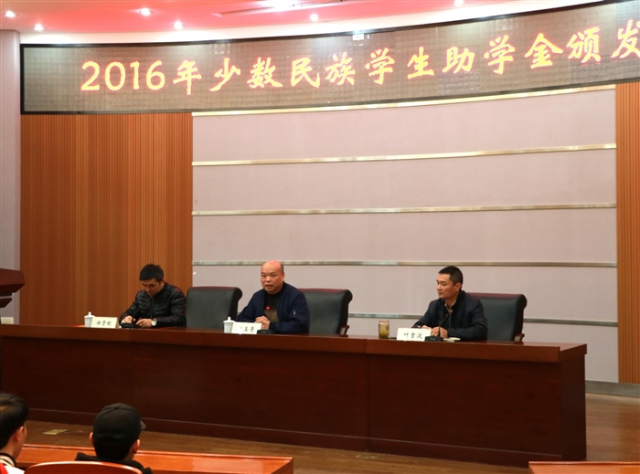 (学生处通讯员 王安琪)11月28日下午,我院在正德楼罗山厅举行2016年少数民族学生助学金颁发仪式。温州市少数民族联谊会会长、学院党委委员、副院长兰玉景出席会议,并为少数民族学生代表颁发了助学金。来自白族、畲族、苗族等16个少数民族贫困学生80多人参加了仪式。