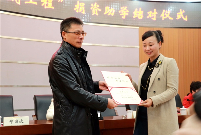 (人文系通讯员 林文龙)11月29日下午,第14届“金瓯工程”捐资助学结对仪式在我院正德楼罗山厅隆重举行。学院党委副书记夏晓军,鹿城区妇联副主席林盈盈,鹿城区女企业家协会会长郑莱莉、常务副会长朱彩霞以及各女企业家及受资助学生出席了结对仪式。