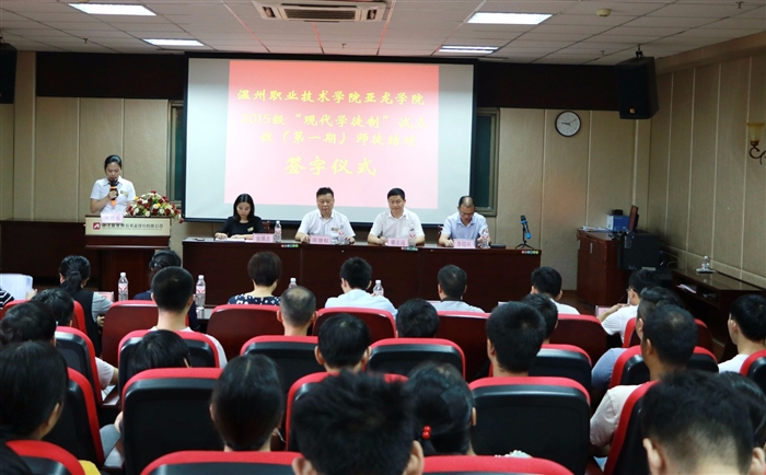 本网讯 10月10日上午,我院在浙江亚龙教育装备股份有限公司(以下简称亚龙教育)会议室举行了温州职业技术学院亚龙学院2015级“现代学徒制”试点班第一期师徒结对签约仪式。我院院长谢志远,亚龙教育董事长陈继权,我院电气电子工程系主任苏绍兴等相关部门负责人出席签约仪式。仪式由亚龙教育市场部副经理章剑云主持。