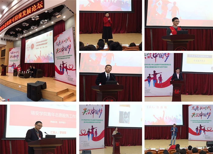 (瑞安学院通讯员 林天芝、团委叶丰)4月1日,温州市青少年公益组织可持续发展论坛暨大学生志愿服务组织学生骨干培训会议在我院瑞安学院隆重举行。学院党委副书记夏晓军、共青团温州市委副书记张嘉祥、共青团瑞安市委书记张挺、全国人大代表郑雪君、发起单位负责人、温州高校公益组织代表、知名公益人和社会公益组织代表共约200余人参会。