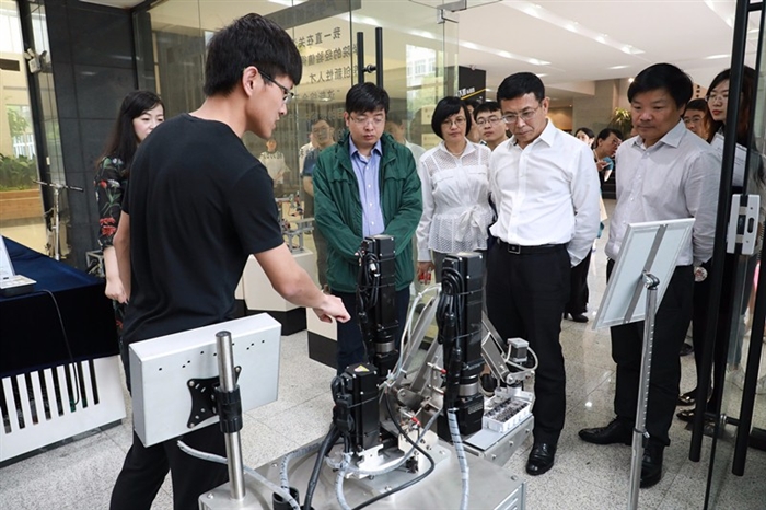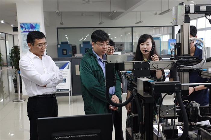 在学院党委书记王靖高、副院长王志梅的陪同下,调研组一行实地参观考察了我院实训基地、技术研发平台等场所,王靖高对我院产学研创平台建设、产教融合等方面的情况作了详细介绍。