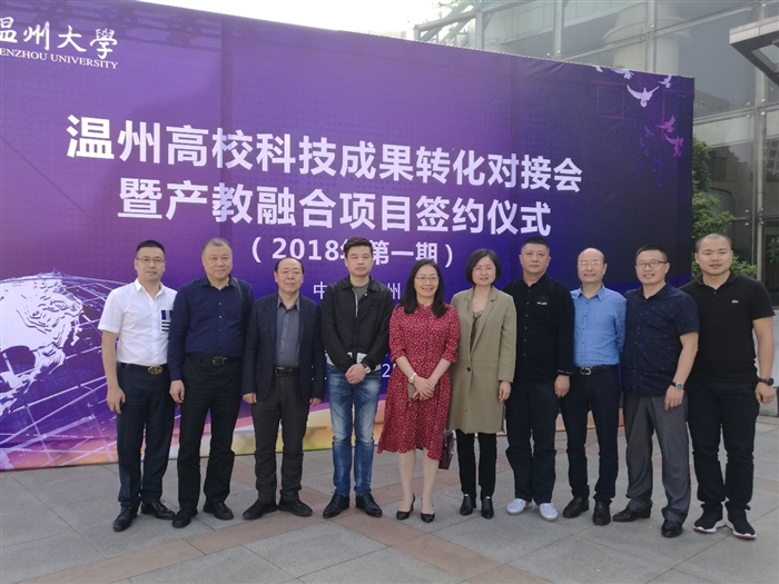 (科技开发处通讯员 易梦伊)4月25日下午, 2018年第一期温州高校科技成果转化对接会暨产教融合项目签约仪式在温州大学举行。我院副院长王向红带队,携科技开发处林海平处长、各项目负责人赴会议现场进行项目对接。