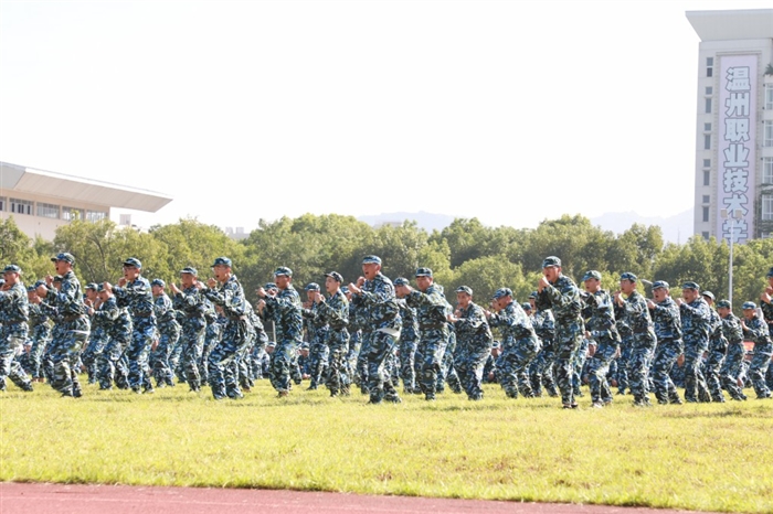 在激昂雄壮的国歌声中,3000余名新生整装列队,以昂扬饱满的精神状态迎接国旗入场。随后,在铿锵的分列式进行曲中,35个方阵军姿整齐,迈着矫健的步伐通过主席台,接受检阅。同学们整齐的步伐、嘹亮的口号,充分展现出军训的成果和新温职人的青春风采。