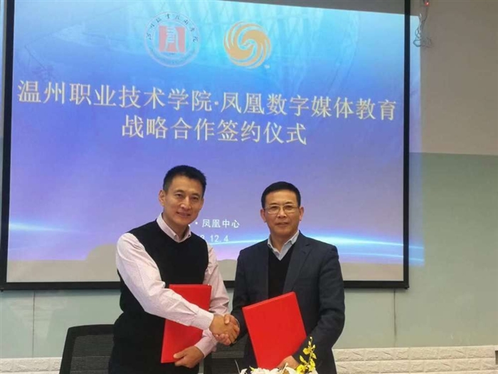 12月4日上午,我院与凤凰卫视·数字媒体产业教育集团签约仪式在北京凤凰中心举行。我院党委书记王靖高一行7人,凤凰教育执行董事、行政总裁吴炜强一行6人出席签约仪式。双方就共同推动我院实施数字创意产教融合战略,打造创新型的数字创意产教融合示范基地、凤凰创意媒体学院,促进温州数字文化经济转型发展等内容达成合作。