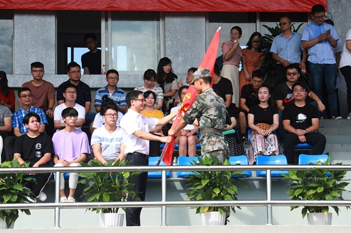 最后,院长方益权为军训团授旗,新生军训正式启动。